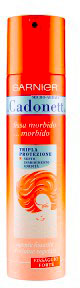 Oggi per conservare una pettinatura impeccabile con qualsiasi tempo c è la lacca Cadonett tripla protezione.Cadonett tripla protezione fissa morbido morbido con qualsiasi tempo.La lacca Cadonett protegge ogni giorno la vostra pettinatura e vi garantisceuna tenuta durevole per tutto il giorno.Contro il vento che spettina i vostri capelli gli attivi fissanti della lacca Cadonett mantengono morbida la pettinatura.Contro le aggressioni quotidiane che possono generare inaridimento.Contro l umidità che li increspa e li appesantisce la lacca Cadonett protegge durevolmente la pettinatura.Una pettinatura setosa e brillanteGrazie al suo sistema di microdiffusione la formula ultra fine della lacca Cadonett si ripartisce facilmente e uniformemente se