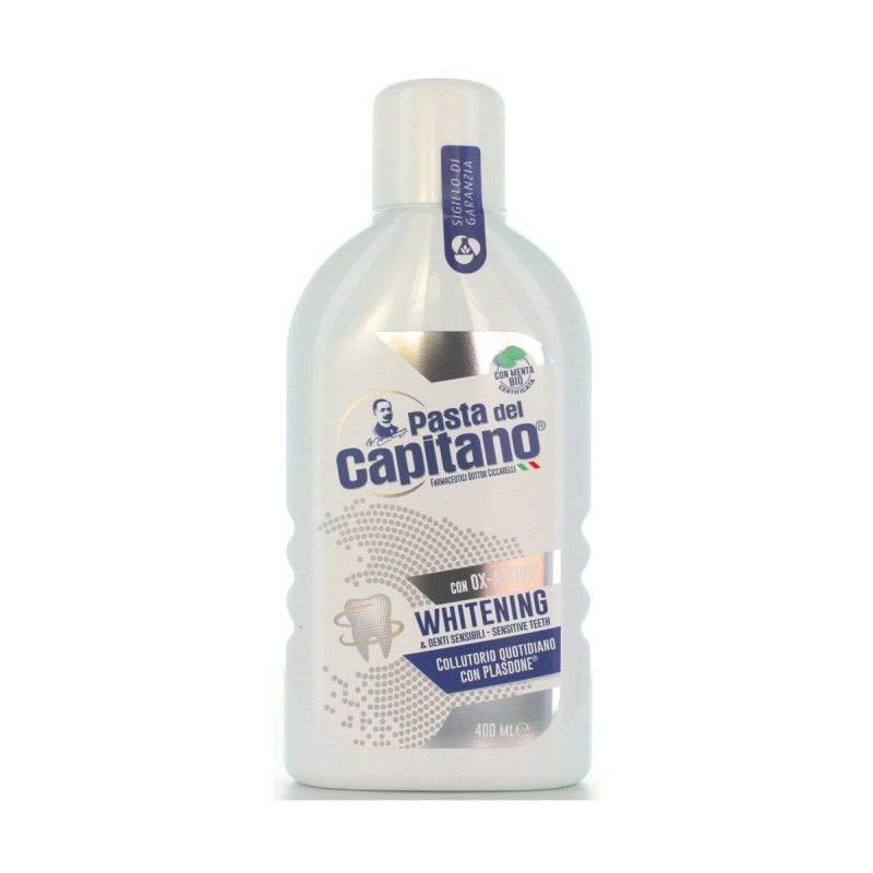 pasta del capitano collutorio ox-active whitening &- denti sensibili è specifico contro le macchie dei denti ed è ideale per chi ha problemi di sensibilità a denti e gengive.la sua specifica formula ad alta tecnologia contiene agenti naturali non dannosi che completano la pulizia del sorriso garantendo un efficacia sbiancante e un ottima tollerabilità per denti e gengive. l efficacia del collutorio ox-active whitening e denti sensibili è garantita grazie alla presenza di attivi specifici:plasdone: agente sbiancante che ridona e mantiene il bianco naturale dei denti senza danneggiare lo smalto dei denti. betaina: lenisce e previene le irritazioni gengivali-potassio citrato: diminuisce la sensibilità dentale-fluoro: rinforza lo smalto dei denti-