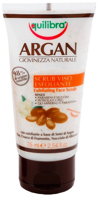 Equilibra Argan Scrub Viso Esfoliante rimuove le impurità e le cellule morte grazie allazione dei microgranuli di Semi di Argan Riso Crusca di Frumento e Nocciolo di Albicocca donando alla pelle del viso luminosità e setosità. La sua texture cremosa e