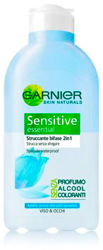 Fa per me?- S? se hai la pelle sensibile.- S? se lo sfregamento legato al d?maquillage sensibilizza la tua pelle.- S? se con i cambiamenti bruschi di temperatura con la stanchezza o con lo stress la tua pelle diventa giorno dopo giorno pi? sensibile.Coma agisce? Lo Struccante bifase 2in1 speciale waterproof di Garnier Sensitive essential associa l estratto vegetale addolcente alla pro-vitamina B5 in una formula bifase che unisce l efficacia struccante degli olii (fase blu) alla freschezza di un tonico (fasetrasparente) in un solo gesto. Come si usa? Agitare il flacone per miscelare le due soluzioni. Detergere il viso gli occhi e il collo con l aiuto di un batuffolo di cotone imbevuto del prodotto. Ripetere l applicazione fino ad ottenere una pelle perfettamente pulita.