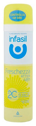 Dai Laboratori Farmaceutici Angelini la generazione di deodoranti con Molecola 2C Betaciclodestrina una straordinaria tecnologia che non copre gli odori ma li assorbe rilasciando una fresca fragranza. La formula di Infasil Freschezza Attiva è sviluppata per offrire un efficace regolazione della traspirazione ed una performance antiodore che dura 48 ore. Più sudi più sai di fresco! – Efficacia antiodore clinicamente testata per 48 ore. – Intensa e fresca profumazione. – No alcool