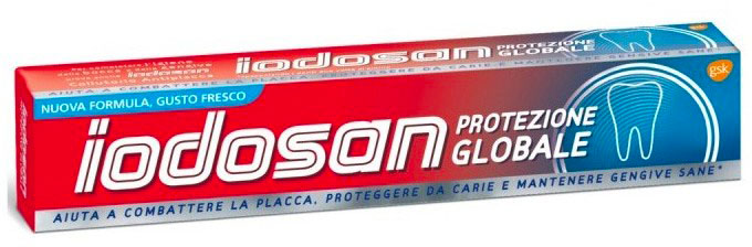 L uso regolare di Iodosan Protezione Globale assicura una completa igiene orale. La sua formulazione contribuisce ad ottenere una protezione quotidiana dei denti. Contiene Monofluorofosfato di Sodio: – aiuta a prevenire l insorgenza di carie. – svolge un azione protettiva e rinforzante dello smalto.La Placca: è una pellicola inizialmente invisibile composta soprattutto da batteri che si deposita sulla superficie dei denti e delle gengive. Gli acidi e gli enzimi prodotti dalla placca batterica sono i principali responsabili dei disturbi a denti e gengive. Le Gengiviti: la placca ristagna neibordi gengivali e causa gonfiore infiammazione e sanguinamento delle gengive. La Carie: è l effetto più immediato dell attacco degli acidi batterici che corrodono lo smalto e intaccano la struttura del dente. Il Tartaro: l accumulo di placca se non rimossa col tempo si calcifica in un deposito