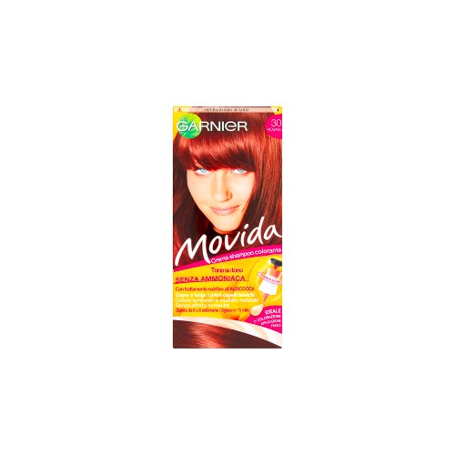Tono su tono senza ammoniaca con trattamento nutritivo all albicoccaGarnier Movida esalta il tuo colore naturale e lo illumina di riflessi coprendo i primi capelli bianchi per 6-8 settimane senza effetto ricrescita visibile.Arricchita con trattamento nutritivo all albicocca la sua formula rende i vostri capelli setosi e pieni di vitalità.Applicazione facile e rapidaGrazie al Colorclic (sistema brevettato) Garnier Movida è pronto in un solo gesto e si applica facilmente come uno shampoo. La sua formula in crema non cola e agisce in soli 15 minuti diffondendo un dolce profumo fruttato per un applicazione piacevole e unica.Garnier Movida è fatto per me?Sì se volete donare al vostro colore naturale riflessi luminosi.Sì se hai fino al 50% d