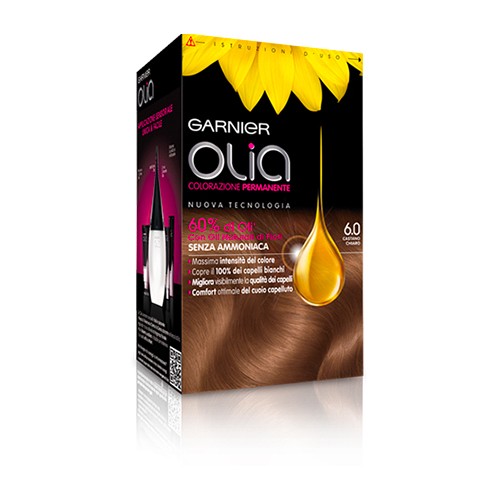 OLIA LA COLORAZIONE ENTRA IN UNA NUOVA ERA. OLIA una svolta nella colorazione Una tecnologia inedita tutelata da 22 brevetti. Grazie ad una formula innovativa attivata dallolio Olia offre la massima intensit? del colore senza ammoniaca. Intensit? massima di colore Garnier Olia ? un espressione inedita del colore. Offre colori intensi generosi profondi. miglioramento visibile della qualit? del capello*** Grazie alle sue performance Garnier Olia migliora visibilmente la qualit? del capello. La morbidezza dei capelli aumenta e la loro brillantezza ? sublimata. COMFORT OTTIMALE DEL CUOIO CAPELLUTO Applicazione sendoriale unica e facile Crema vellutata che non cola Delicata fragranza floreale