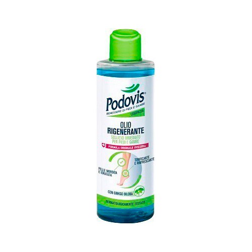 Olio Rigenerante sollievo immediato per piedi e gambe. CARATTERISTICHE Dona un immediato sollievo ai piedi e alle gambe stanche per un momento di relax unico. Svolge una triplice azione tonificante idratante e rinfrescante. La sua speciale formula contiene: estratto di Ginkgo Biloba dalle naturaliproprietà energizzanti e defaticanti- attivi dallUlivo per rendere la pelle morbida e vellutata- olio essenziale di menta per una piacevole sensazione di freschezza. Grazie alla sua texture leggera si asciuga rapidamente. Ideale per chi trascorre molte ore in piedi. lOlio Rigenerante Podovis® èutilizzabile tutti i giorni dopo la doccia o durante un massaggio per un rituale di benessere completo. Dermatologicamente testato. CONSIGLI D USO Applicare su pelle pulita e asciutta con un leggero massaggio: Pianta del piede: esercitare una leggera pressione con i pollici in senso longitudinale